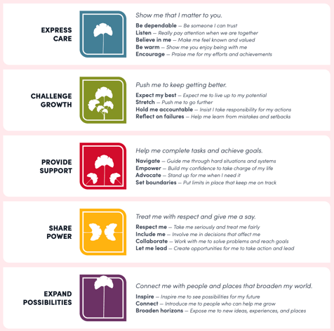 Research and practice show us that young people who experience these elements from a web of caring adults are more likely to develop resilience and succeed in their schools, workplaces, and communities.