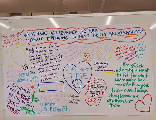 These weren’t just feel-good stories, they were measurable shifts. Schools used Search Institute’s Developmental Relationships Survey as a diagnostic assessment, helping SSN to identify areas of focus. Teams collected practical data along the way to monitor their work—this included feedback from staff and students, as well as quantitative data to assess progress, revealing significant growth in connection and collaboration.