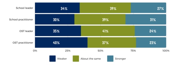 The data provide insights into how school and OST staff perceived changes in their relationships with youth and families. Furthermore, the findings show that many school and OST leaders and practitioners feel that their relationship-building efforts need to address the trauma that young people have experienced during these challenging times — and that they have experienced in general. In other words, building strong relationships with young people requires trauma-informed care and spaces to support them.